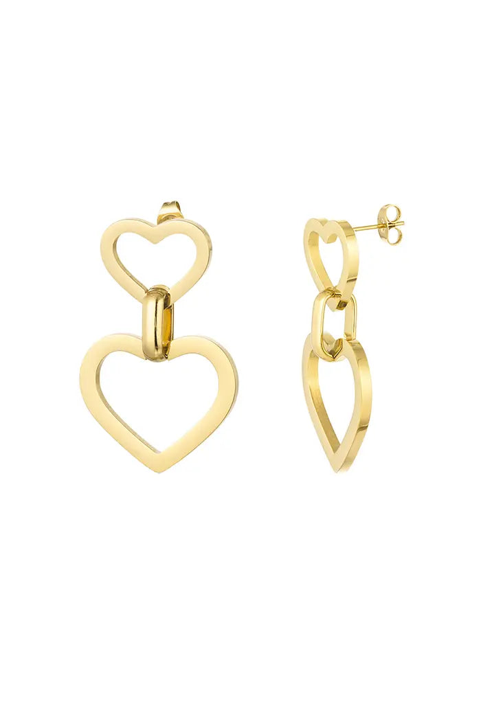 Je word helemaal verliefd op deze oorbellen met de vorm van 2 hartjes die verbonden zijn door een schakel. Een echte eyecatcher waar je verliefd op word! De oorbellen zijn gemaakt van stainless steel en hebben een afmeting van 3,9 cm.